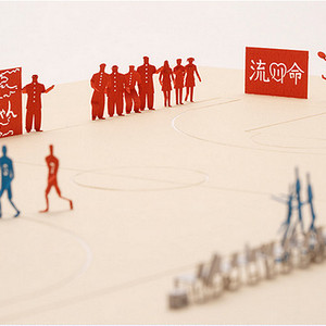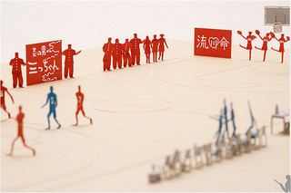 公交站台、树木、长椅,人和狗,甚至细致到飘落的樱花花瓣,我们生活的场景都被按照1/100的比例缩小了。这些大大小小的模型都是用激光切割的,形状需要人们从纸板上扣下来,再黏上胶水,在一张卡片大小的纸上摆出造型。其中的一个小窍门是,人的腿底端要折一下,这样就能在纸板上固定成不同的姿势。