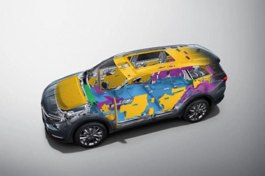 从源头阻隔噪音是最基本的降噪方式,在别克昂科旗上,发动机舱内采用了超厚的发泡隔音垫来阻隔发动机噪音,并且车身进行了工艺改良,密封性上有质的提升,可能带来震动噪音的副车架与悬架则采用了液压衬套来进行有效阻隔。最后采用夹层声学玻璃和车身夹层声学包来进行驾乘舱内的噪音全方位阻隔,哪怕是底盘部分也不放过,额外增加了声学底盘护板来降低路面噪音,这种量级的 NVH 工程在同级别车型当作,是绝无仅有的。