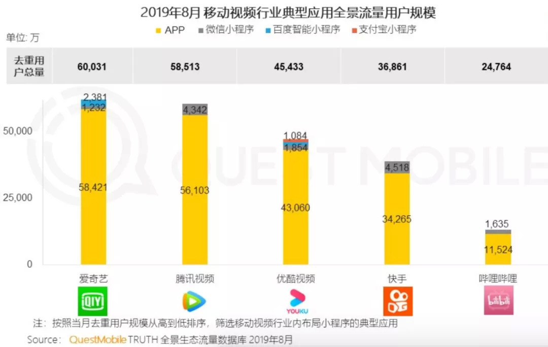 根据Questmobile数据显示,截止到今年8月,爱奇艺在移动视频全景用户规模上,位居行业首位,用户总量超6亿。