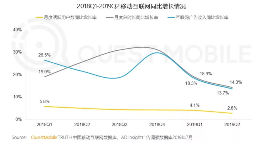 聚焦到爱奇艺重力布局的互联网广告市场,根据Questmobile《2019移动互联网广告营销半年报告》显示,国内互联网广告收入同比增长率在去年第四季度到达顶点后便一路下滑,到今年第二季度跌至近两年最低点13.7%。