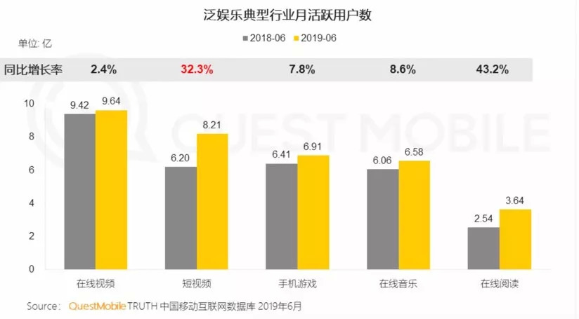 根据Questmobile《短视频2019半年报告》显示,在泛娱乐典型行业中,短视频的月活跃用户数以32.3%的增长率排名第一,远远超过了排名末尾、只有2.4%增长的在线视频行业。