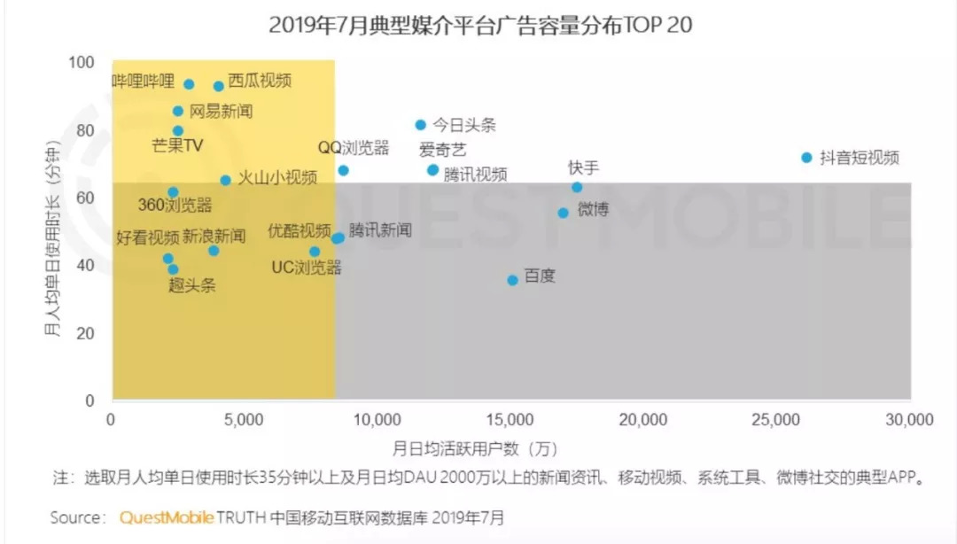 根据Questmobile《2019移动互联网广告营销半年报告》显示,在今年7月的典型媒介平台广告容量TOP20中,抖音、快手的广告容量远远超过了爱奇艺。