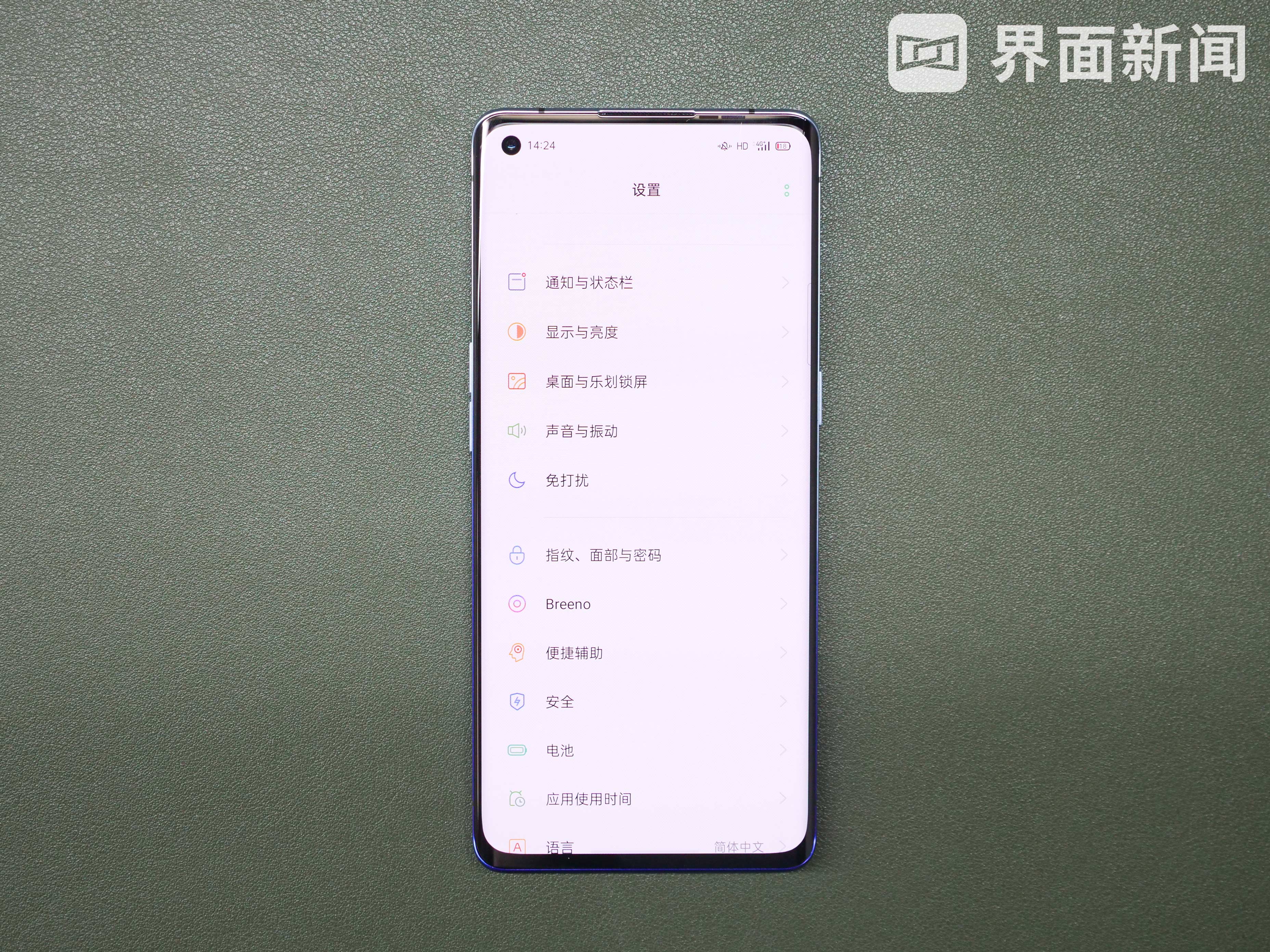 Reno3 Pro整体来说是一个瘦长的造型,采用了一块6.5英寸屏幕。亮屏以后,正面为曲面挖孔屏,开孔大小为3.92mm。系统提供环形电量显示功能,开启以后,电量百分比可以显示在摄像头的周围。