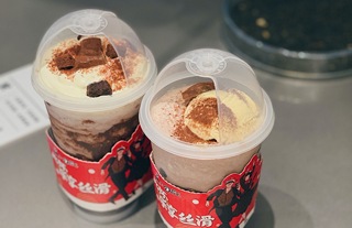 最近乐乐茶与德芙合作系列便是最好的例子,二者近日推出了多款以巧克力为主题的饮品和甜点。饮品系列有两款,分别为德芙经典巧克力脏脏茶和德芙榛子巧克力冰冰茶,前者用将醇厚牛乳与奶油可可酱结合,呈现出厚实却顺滑的独口感;后者虽然为冷饮,但却通过榛果的加入来营造出属于假日的愉悦滋味,除了丝滑口感外,略带甘甜的木质香气也非常吸引人。