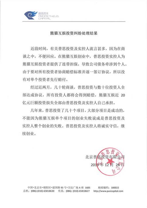 2019年,国民老公“王思聪”遭遇滑铁卢。自3月熊猫直播关闭后,王思聪娱乐帝国风雨飘摇,被多家公司起诉追债,其本人也被法院限制高消费。王思聪到底欠多少钱?12月26日,普思资本对外发布公告,披露了熊猫互娱投资纠纷的处理结果。公告称,经过近两月,几十轮商谈,普思投资与熊猫互娱数十位投资人全部达成协议,所有投资人都得到了赔偿,熊猫互娱近20亿元巨额投资损失全部由普思投资及实控人自己承担。
