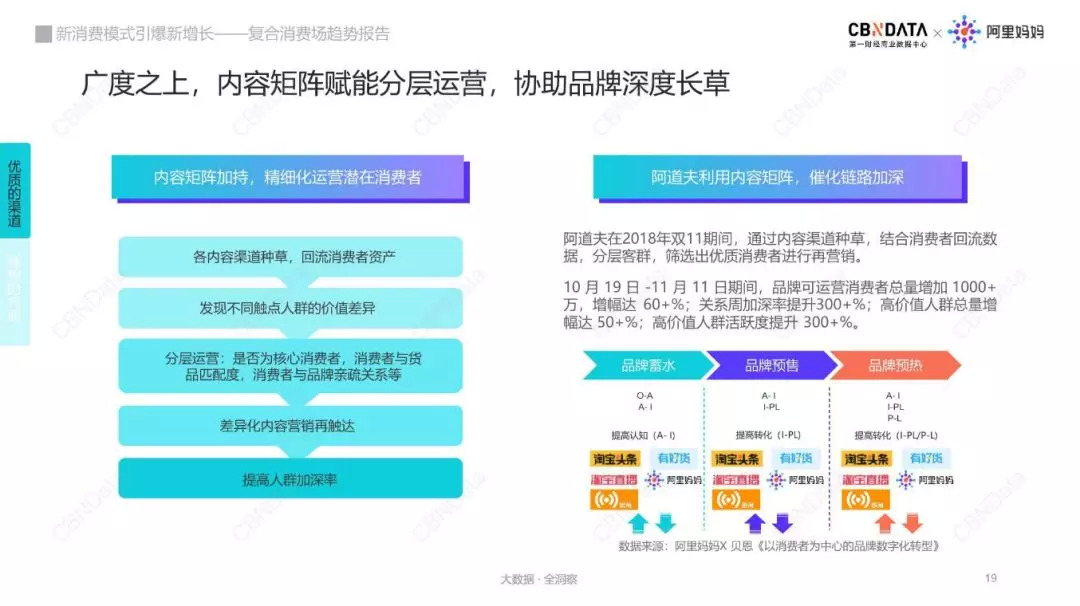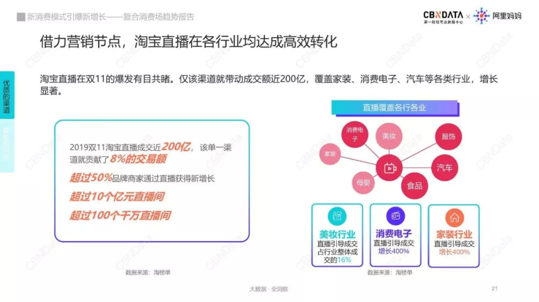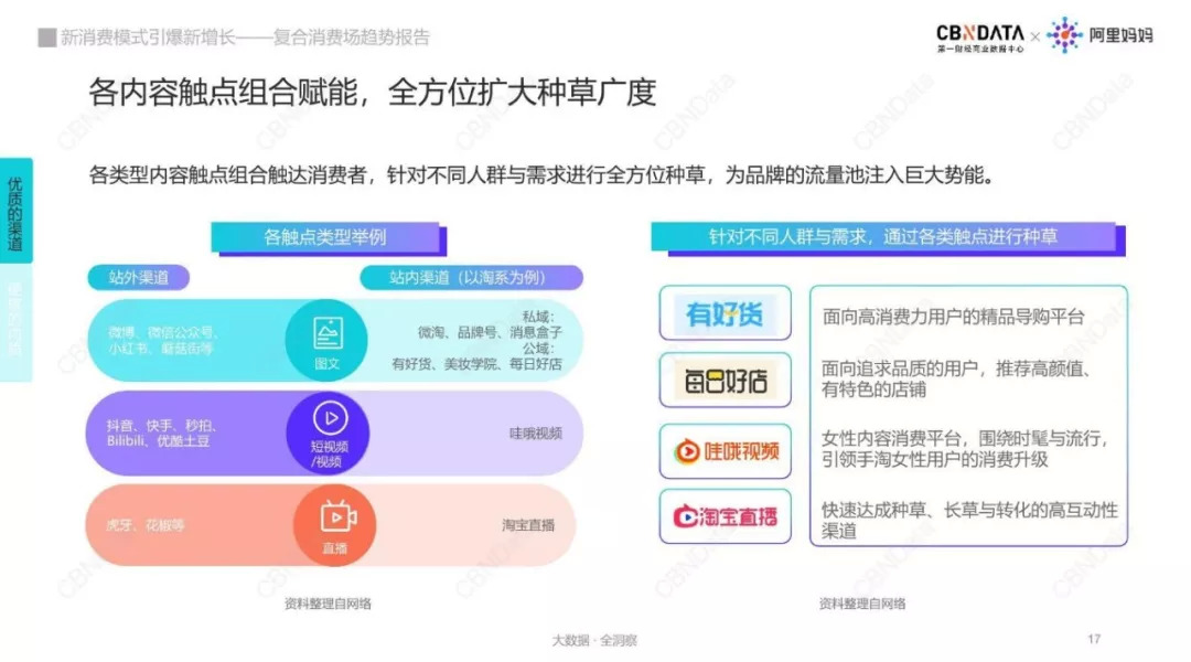 以最大的复合消费场淘宝为例,目前已完成直播、图文与短视频等全方位内容矩阵的搭建;以淘宝直播为例,它极大提升了核心用户对平台的粘性,日均停留近一小时,扩大了消费者的需求密度,高效的转化也随之达成。