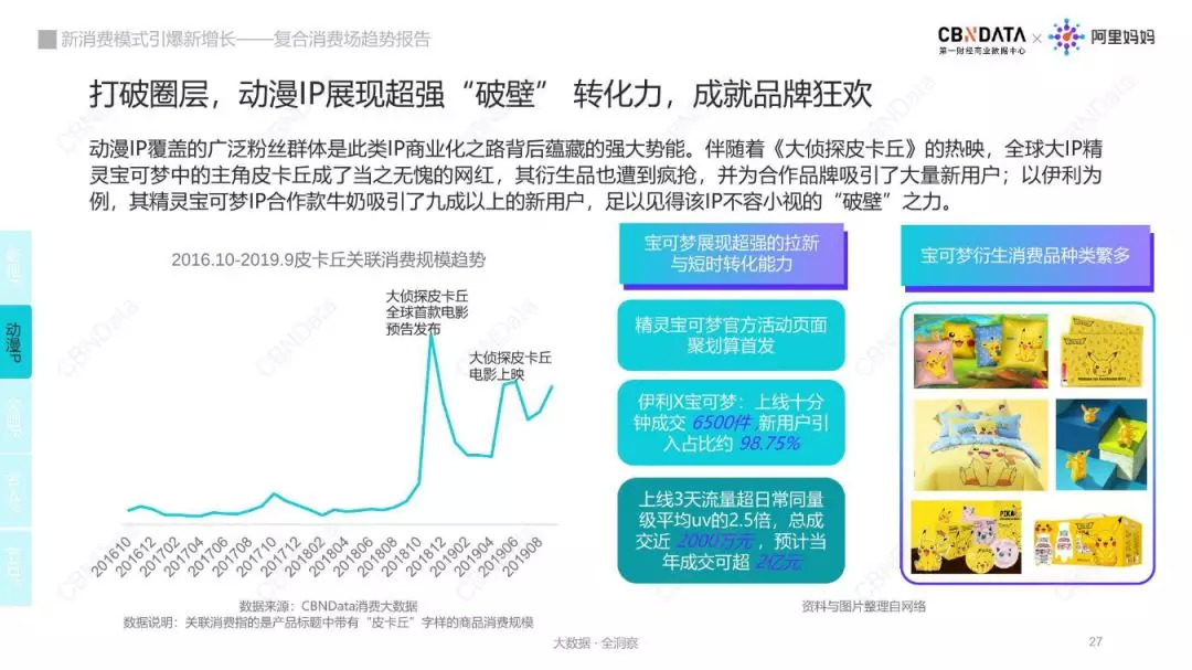 动漫IP覆盖的广泛粉丝群体是此类IP商业化之路背后蕴藏的强大势能。以全球大IP精灵宝可梦为例,伴随着《大侦探皮卡丘》的热映,主角皮卡丘成了当之无愧的网红,其衍生品也遭到疯抢,并为合作品牌吸引了大量新用户。
