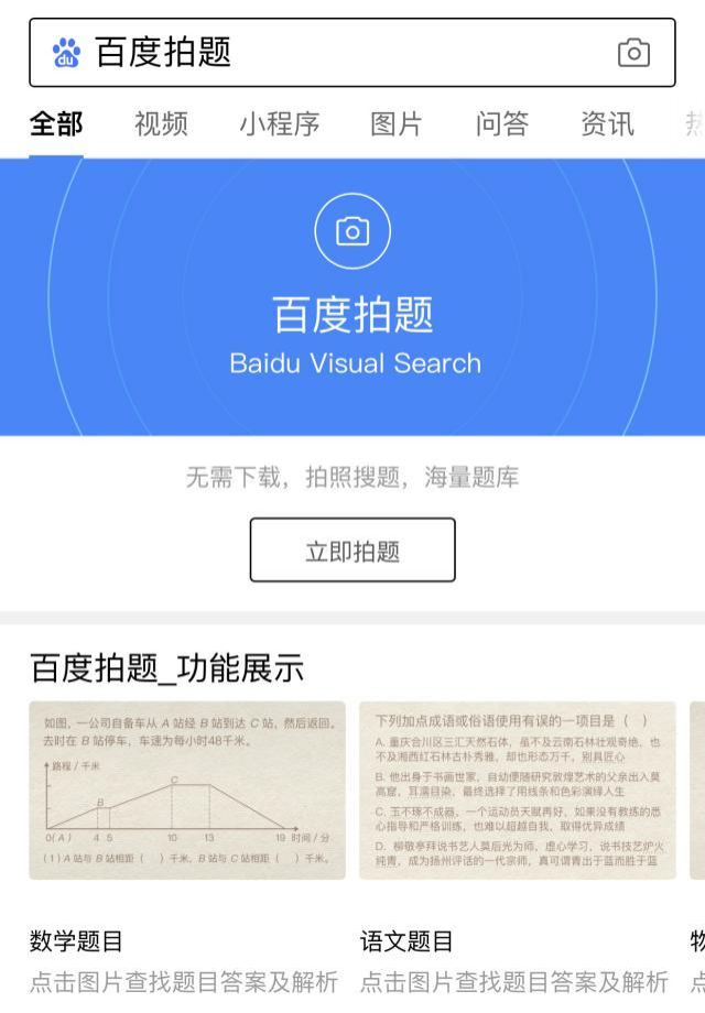 在百度App直接搜索“百度拍题”,就会看到百度拍题的卡片以及百度拍题智能小程序。点击相机图标或者“立即拍题”,按照要求对准题目进行拍摄,就会自动秒出答案。不论你是数学、英语,还是物理、化学等其他学科,百度搜题都能准确秒出你想要的答案,而且内容详尽、重点突出,不仅是给出答案,还会教你解题思路。此外,百度拍题还支持一次拍摄多道题,避免了反复拍题的麻烦。