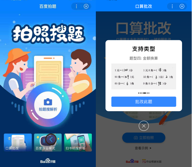 如果你以为百度拍题这么些功能,那就小看它了,在百度拍题智能小程序中,还集合了更多的功能。除了上面提到的拍题搜解析之外,还有一键拍照进行口算批改,加减乘除运算、数字比大小、金额换算、金额比大小等都能拍照批改,这对于低年级的学生家长来说,绝对是一种“解放”。