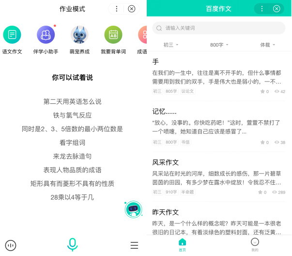 另外,在百度搜题智能小程序中,还有百度作业模式,支持用语音搜答案,智能识别语音,互动体验感非常强。其中,还延伸了语文作文、背单词以及单词查询等功能,同样能满足不同学龄学生家长的需求。