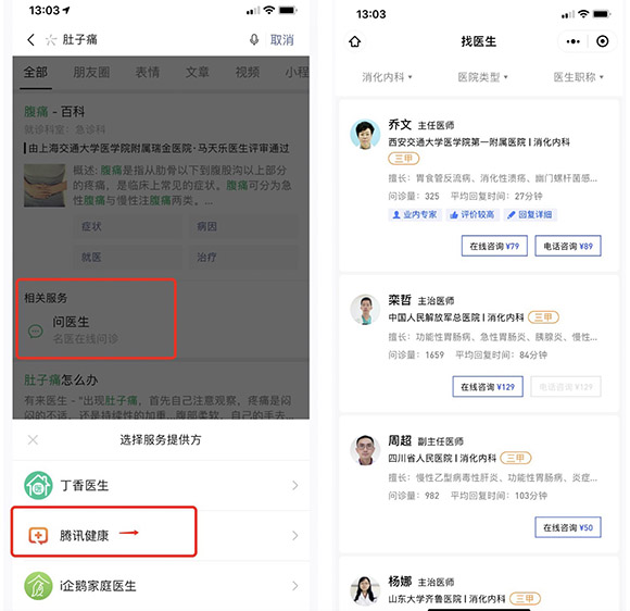 “问医生”的医生均来自腾讯健康、丁香医生、企鹅医生、好大夫等众多医疗平台的权威医疗资源。点击进入后,即可看到对应的微信小程序。