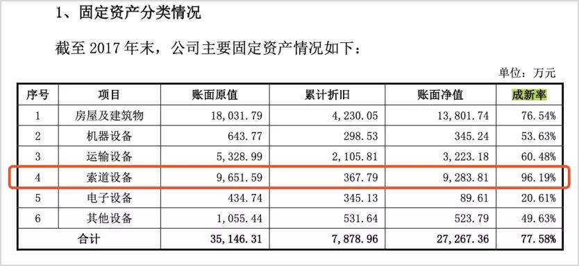据了解,成新率存疑产品为西域旅游索道设备——马牙山索道。招股书上显示,马牙山索道最早于2014年7月投入运营,至2017年末已成功运营3年有余,然成新率却高达96.19%。这是设备折旧年限特别长所导致的吗?
