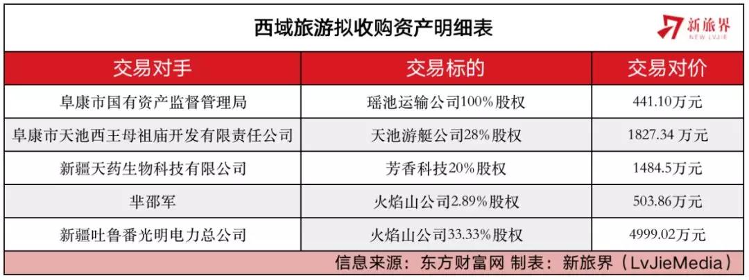 具体而言,西域旅游拟收购阜康市国有资产监督管理局合法持有的新疆瑶池旅游运输有限公司(下称“瑶池运输公司”)100%股权,交易对价441.10万元;成功竞拍标的阜康市天池游艇经营有限公司(下称“天池游艇公司”)28%股权,出手价1827.34 万元;现金购买新疆天药生物科技有限公司(下称“天药生物”)持有新疆天然芳香农业科技有限公司(下称“芳香科技”)20%股权,对价1484.5万元;向自然人芈邵军、新疆吐鲁番光明电力总公司收购其持有的吐鲁番火焰山旅游股份公司(下称“火焰山公司”)2.89%、33.33%股权,对价分别为503.86万元、4999.02万元,合计对价5502.88万元、股权36.22%。