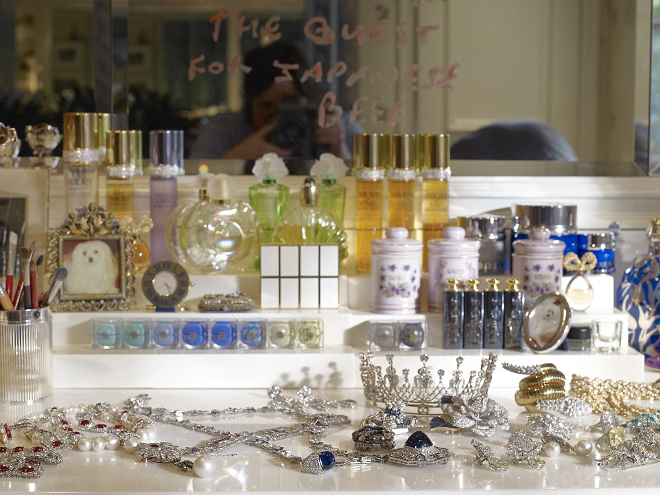起居室里有一副画作十分引人注目。画上是一双嘴唇,画的一旁写着:“献给伊丽莎白,一个大大的吻,安迪·沃霍尔。”在床边我们能够看到一张儿童画,写着:“孙女帕丽斯·杰克逊献上。”伊丽莎白的手包以颜色分类排列——红、金、黑、紫、蓝、绿、白。衣服则以面料分类排列——粉金的丝绸长袍、一整柜子的飞行员夹克、成沓的蕾丝花裙、一排各色的皮草外套。