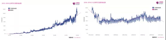 左图为,2012年至2018年比特币活跃地址趋势线;右图为,2018年至2019年比特币活跃地址趋势线(图片源自:Coin Metrics)