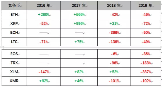 部分竞争币价格的历史年增长情况(以BTC为单位,数据源自:Coinmarketcap)