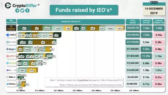 如下图所示,截自本月14日币安、OKEx、Bittrex、Huobi等大型加密货币交易所通过IE0的方式上线五十余个项目,并筹得约1.62亿美元的金额,各平台项目平均收益率均高于1.9倍。忽略相关项目当前超六成的破发率,这种具有一定财富效应的融资方式确实给年初熊态尽显且热点匮乏市场带去希望。