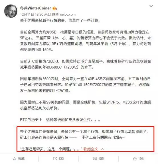 众所周知,比特币挖矿奖励减半将引发新一轮牛市是币圈的普遍共识,也是目前为止的历史规律。就像市场讨论的结果一样,明年历史会不会重演现在还不得而知,不过矿圈怀着美好愿望咬牙坚持的故事今年已经开始。