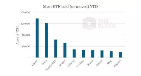 ※据The Block数据显示,过去一年时间里,57个代币融资项目平均每月清算或者转移2500枚ETH。这些项目共筹资820万枚ETH,其中590万枚已被转移或者清算,占到总融资金额的72%。(部分代币融资项目2019年的ETH抛售情况,图片截自:The Block)
