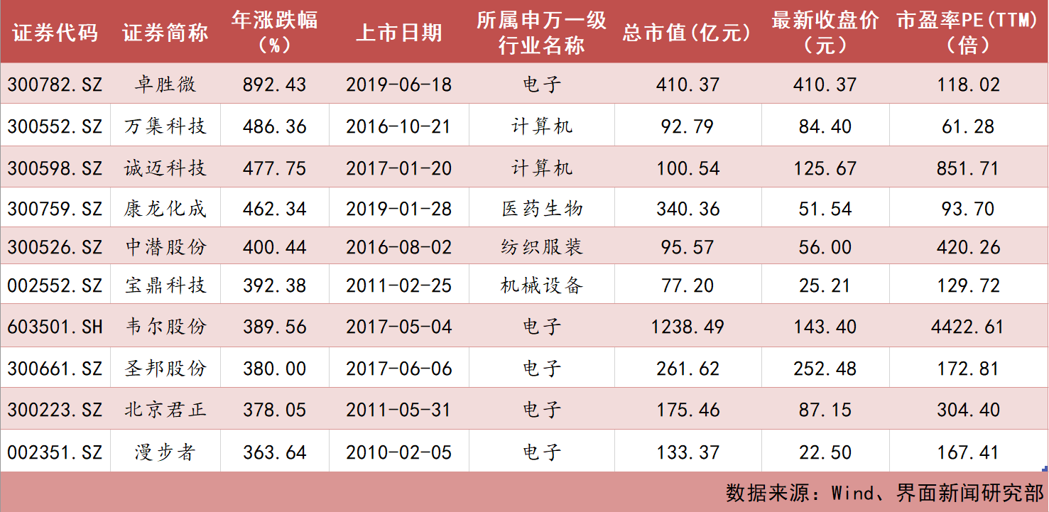 卓胜微(300782.SZ)虽然在今年6月18日才登录创业板,但全年已实现892.43%的涨幅,稳居榜首。上市后公司股价不断抬升,从42元经历了14个连续涨停,如今股价已超400元,总市值达410.37亿元。