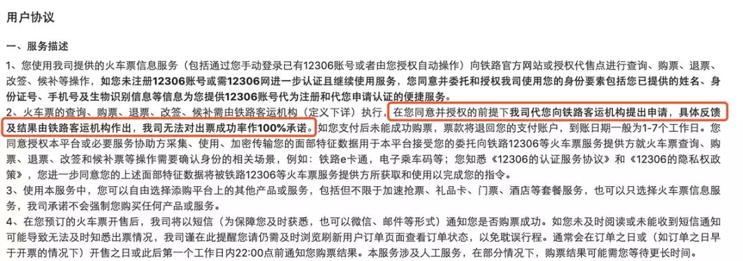 某OTA在《火车票信息服务协议》中强调:出票结果由12306决定