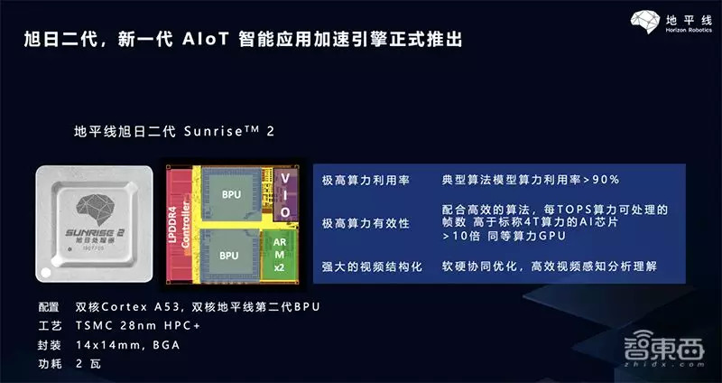 就在前三个月,地平线先后推出首款已量产车规级边缘AI视觉芯片征程2.0,和第二代边缘AI芯片旭日2.0以及一站式全场景边缘AI芯片解决方案,芯片等效算力均达到4 TOPS,典型功耗仅2W。