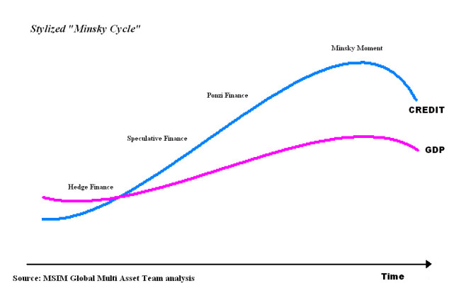 *明斯基时刻表示的是市场繁荣与衰退之间的转折点。明斯基的观点简单明了:好日子的时候,投资者敢于冒险;好日子的时间越长,投资者冒险越多,直到过度冒险。一步一步地,投资者会到达一个临界点上,其资产所产生的现金不再足以偿付他们用来获得资产所举的债务。投机性资产的损失促使放贷者收回其贷款。从而导致资产价值的崩溃。