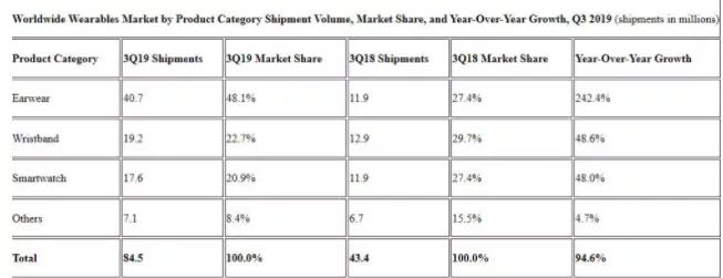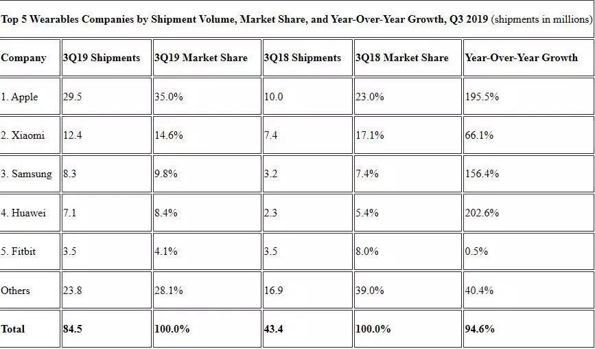 根据IDC发布的最新数据显示,2019年Q3全球可穿戴设备出货量总计达8450万部,同比增长94.6%。苹果、小米、三星、华为、Fitbit占据前五强,而这一领跑阵营的品牌身影与去年同期如出一辙,甚至连排位座次方面都几乎没发生什么变化。
