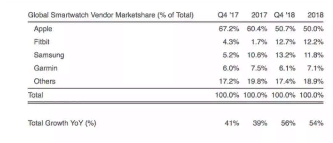 这其中,苹果是这一领域当之无愧的佼佼者,Counterpoint Research统计的2018年智能手表产品销量TOP 5中有三款是Apple Watch。其领跑地位也正日益稳固,在Strategy Analytics发布的研究报告中,Apple Watch的全球市场份额已经从2018年第三季度的45%增长到2019年第三季度的48%。