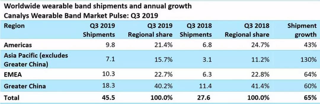 2019年第三季度,全球智能手环出货量达到4550万件,同比大幅增长65%。其中大中华地区同比增速达到60%,市场份额占比全球的40.2%。
