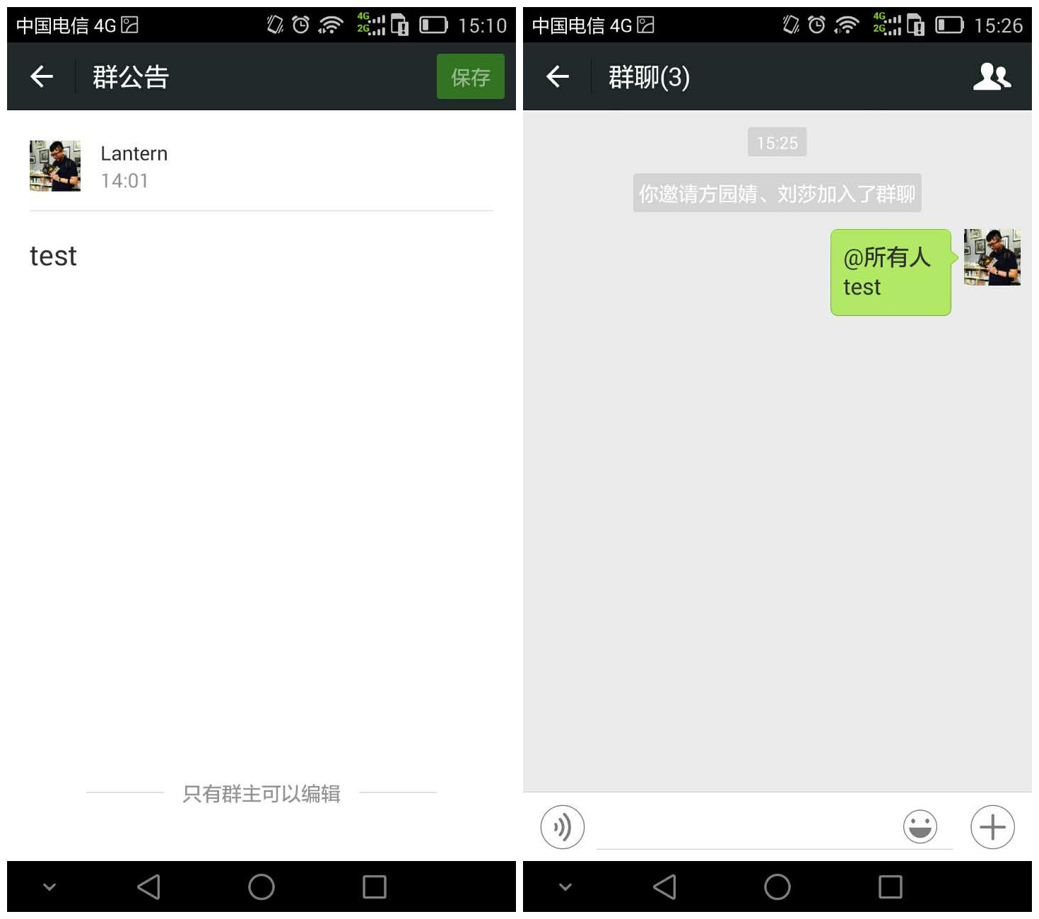 像QQ群一样,群主可以添加群公告,编辑完毕后,自动在群聊天里面发布。