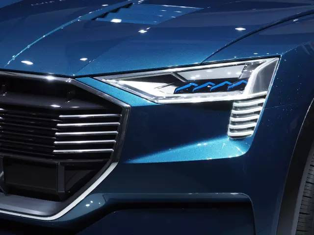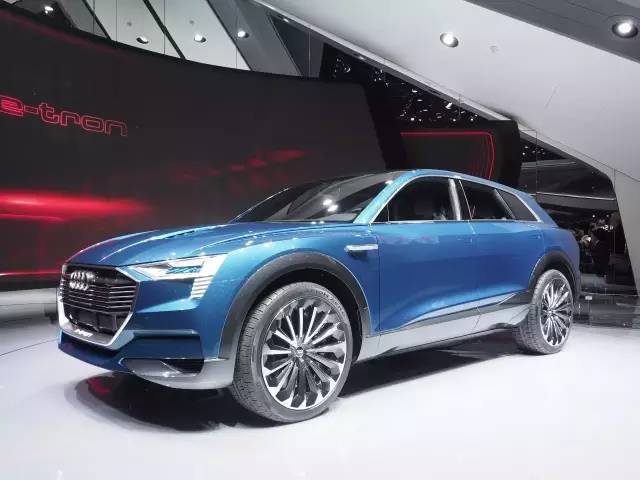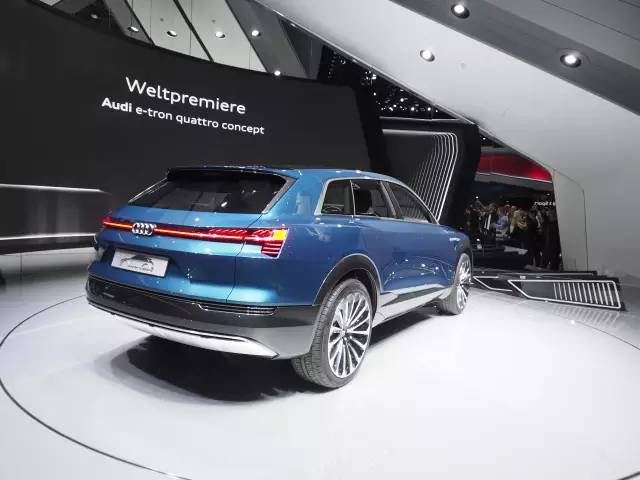 也许是想与竞争对手奔驰GLE和宝马X6较为圆润的曲面语言有所区分,奥迪发布的e-tron Quattro Concept的设计语言更加硬朗,以立体主义风格为代表的棱角切割面越来越丰富,以至于很难在e-tron Quattro身上找到老奥迪的影子。运动与科技,仍然是奥迪借助e-tron Quattro向大众传达的两个核心品牌理念:带有OLED光源的激光矩阵大灯和贯穿LOGO的后尾灯彰显着“灯厂”在细节设计上高人一等的创新力,前格栅的矩形断面与竖向罗列的矩形灯带呼应,彰显科技感。