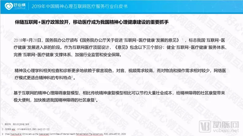 2018年4月,国务院办公厅颁布《国务院办公厅关于促进“互联网+医疗健康”发展的意见》,标志我国“互联网+医疗健康”发展进入新的阶段。因为精神及心理相关学科的检查和诊断更多依赖于察言观色,对音、视频需求较高,而对物流和操作需求相对较少,网络医疗模式更适合精神科的专科特点。
