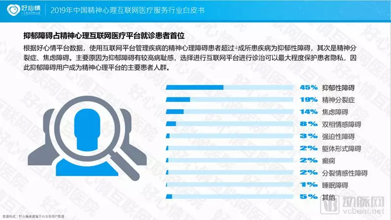 主要原因为抑郁障碍有较高病耻感,选择进行互联网平台进行诊治可以最大程度保护患者隐私,因此抑郁障碍用户成为精神心理平台的主要患者人群。