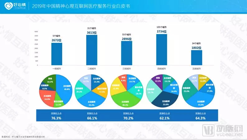 根据好心情平台数据,医生的分布相对比较均匀,主治医生是选择互联网医院进行执业的主力军,一线城市副主任医师和主任医师也有很大占比。