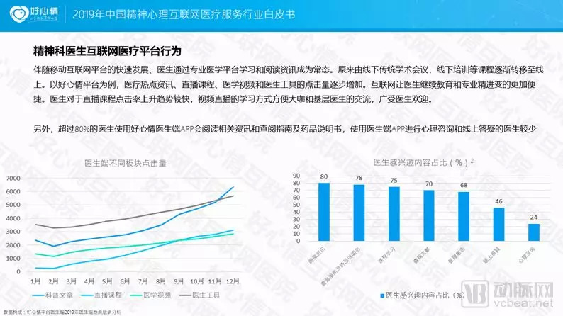 以好心情平台为例,医疗热点资讯、直播课程、医学视频和医生工具的点击量逐步增加。互联网让医生继续教育和专业精进变的更加便捷。医生对于直播课程点击率上升趋势较快,视频直播的学习方式方便大咖和基层医生的交流,广受医生欢迎。