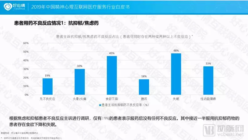 用药不良反应是精神障碍服药依从性差的主要原因之一。根据患者主诉,服用抗抑郁/抗焦虑的患者当中,仅有19%的患者表示自己服药后没有产生任何不良反应。大部分患者表示自己会存在两种或两种以上的不良反应,其中主要的不良反应包括食欲下降和失眠。