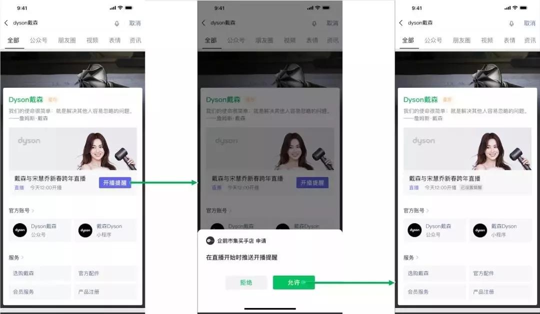 在今天的公开课上,微信官方解读搜一搜的新能力时,强调了专属直播预约功能。以电商为类,用户通过搜一搜关键词搜索内容后,可以看到品牌直播卡片,用户可以主动预约观看直播,接受开播通知,并在直播中边看边买。
