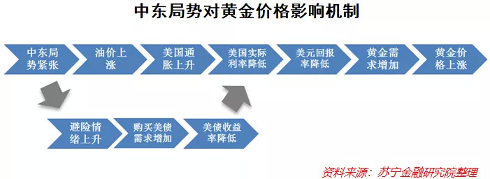 同时,美国国债作为全球良好的避险资产,一旦中东局势紧张,也会产生大量的购买美债需求,美债收益率走低,美国实际利率降低,最终导致黄金价格上涨。
