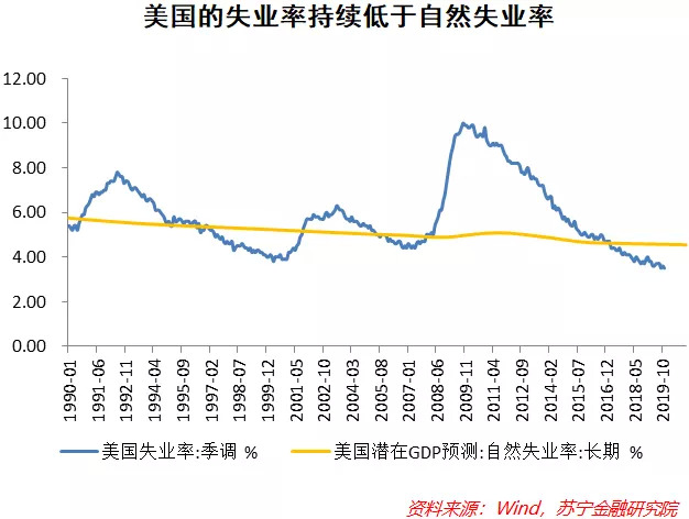 从美国经济来看,衰退的概率在提升。尤其是从就业情况来看,美国失业率已经持续下降了超过10年,当前的失业率水平已经显著低于美国的自然失业率(充分就业水平)。经济内含的周期性作用可能在未来愈加明显。