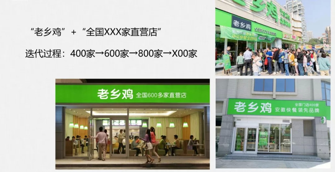 先来看看它的门头,大家也能看到,他的门头非常朴素、很简单,只有“老乡鸡”的品牌名加上“全国400家直营店”的宣传语,即使后续再怎么迭代也只是改了直营店的数字部分,由400改成了600,由600改成了现在的800。