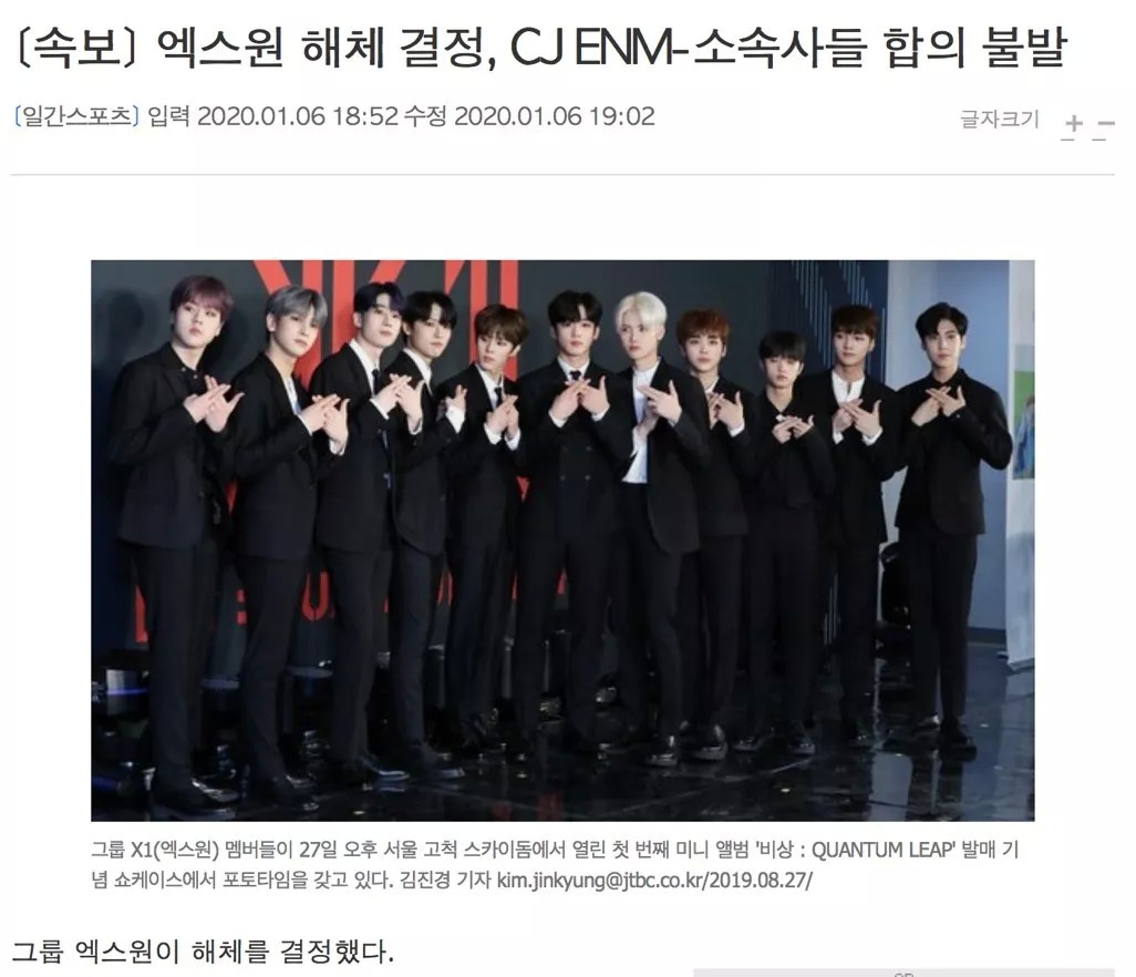2020年1月6日下午4点,韩国Mnet电视台制作的选秀节目《Produce X101》出道团X1各成员所属经纪公司的相关人士与Mnet所属的CJ ENM公司、负责X1运营的Swing娱乐进行了会面,大约三小时后,X1解散的速报在全网传播开来。