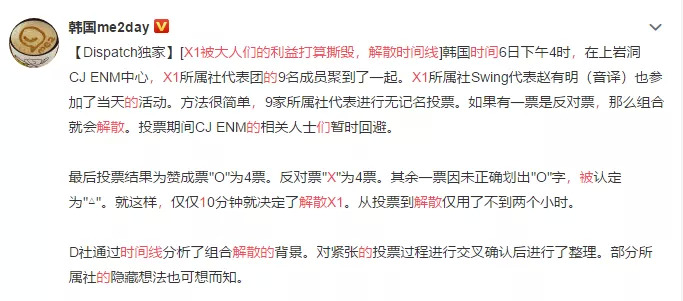 1月6日X1宣告解散后,韩媒Dispatch于1月9日独家发布了所属社协商过程细节,标题为《X1:被大人们的利益打算撕毁,解散时间线》,其中提到X1全体成员们均希望组合能够存续并提出了参加会议的要求,“有一定要对代表团说的话”,但遭到几家公司代表的拒绝而未能出席。