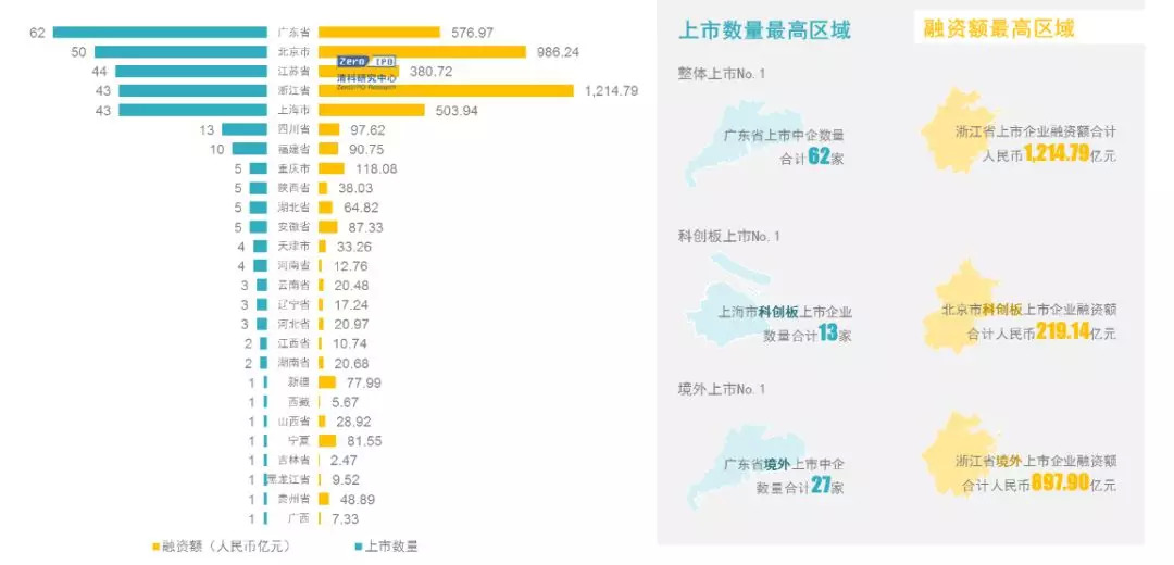 从地域分布来看,根据清科旗下私募通数据统计,2019年上市中企主要分布于京津冀、长三角、珠三角地区,其中广东省上市中企数量领先全国其他省市及地区,而浙江省上市中企获得最高首发融资额。上海市及北京市的企业在科创领域表现更佳,上海市共计13家企业登陆科创板,获得融资超过人民币150亿元;北京市共计12家企业登陆科创板,获得融资超过人民币200亿元。
