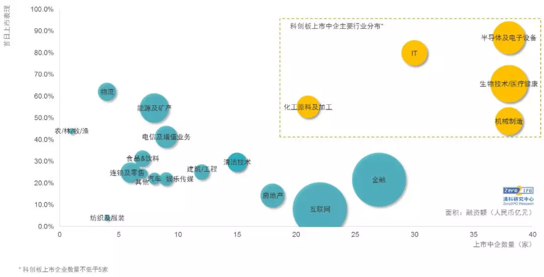 从行业分布来看,半导体及电子设备、生物技术/医疗健康、机械制造领域中企上市数量领先其他行业,而互联网及金融领域获得较高的首发融资额。整体来看科创板上市企业集中度较高的行业(半导体及电子设备、生物技术/医疗健康、机械制造、IT、化工原料及加工)首日上市表现较为优异,首发融资额适中。