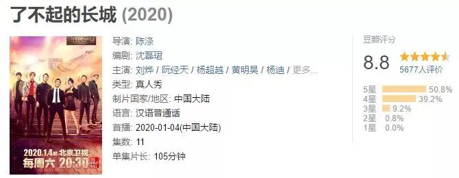 另一边,1月4日开播的《了不起的长城》也取得了口碑上的开门红,目前豆瓣评分已从开画的8.6涨至8.8,零一星评价。