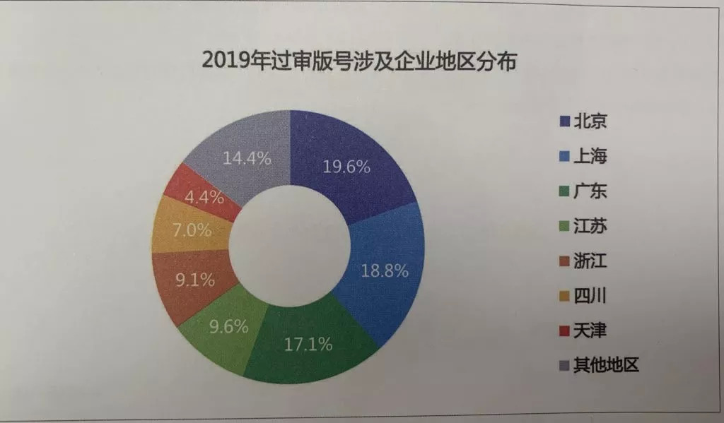 5.2019年过审版号的游戏企业地区分布中,广东占17.1%,排名第一的是北京,占比高达19.6%;