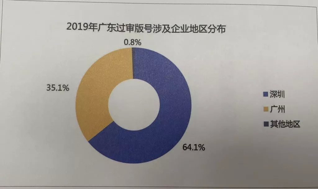 在过审版号情况方面,2019年过审版号的游戏企业地区分布中,广东占比仅为17.1%,排名第一的是北京,过审版号涉及企业占比高达19.6%。不难看出,虽然在全国范围内广东游戏企业占比较高,但企业版号过审状况却不容乐观,这与广东游戏企业的构成相关,小型企业的占比较大,因此在版号获取能力上并不强。