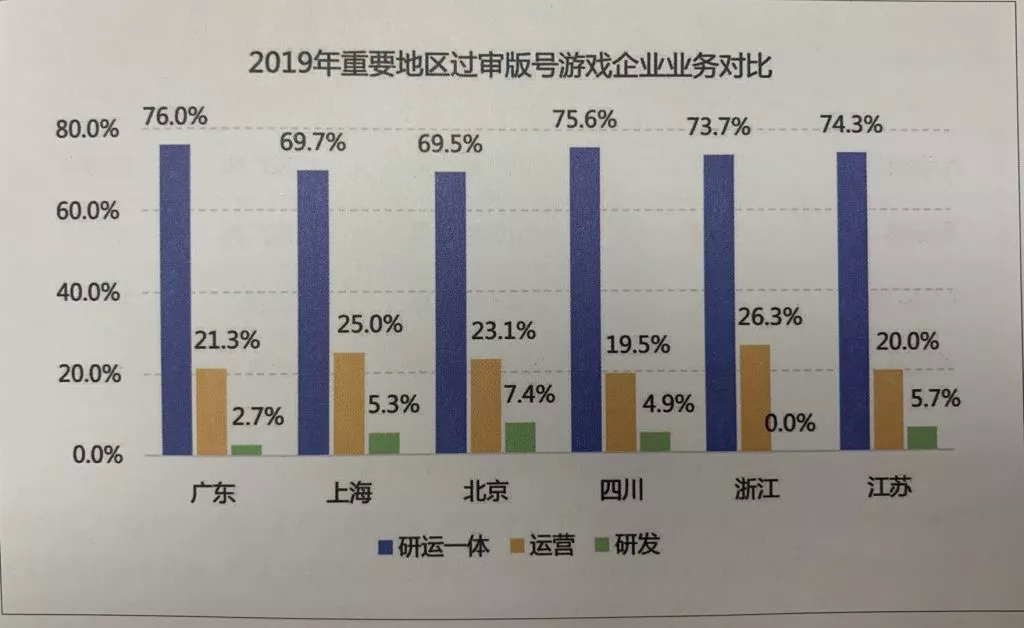 不过,在2019年广东过审版号游戏企业业务分布上,研运一体的游戏企业占比最高,达到76%,位列全国第一,而运营类游戏企业占比为21.3%,而纯研发游戏企业的占比仅为2.7%。