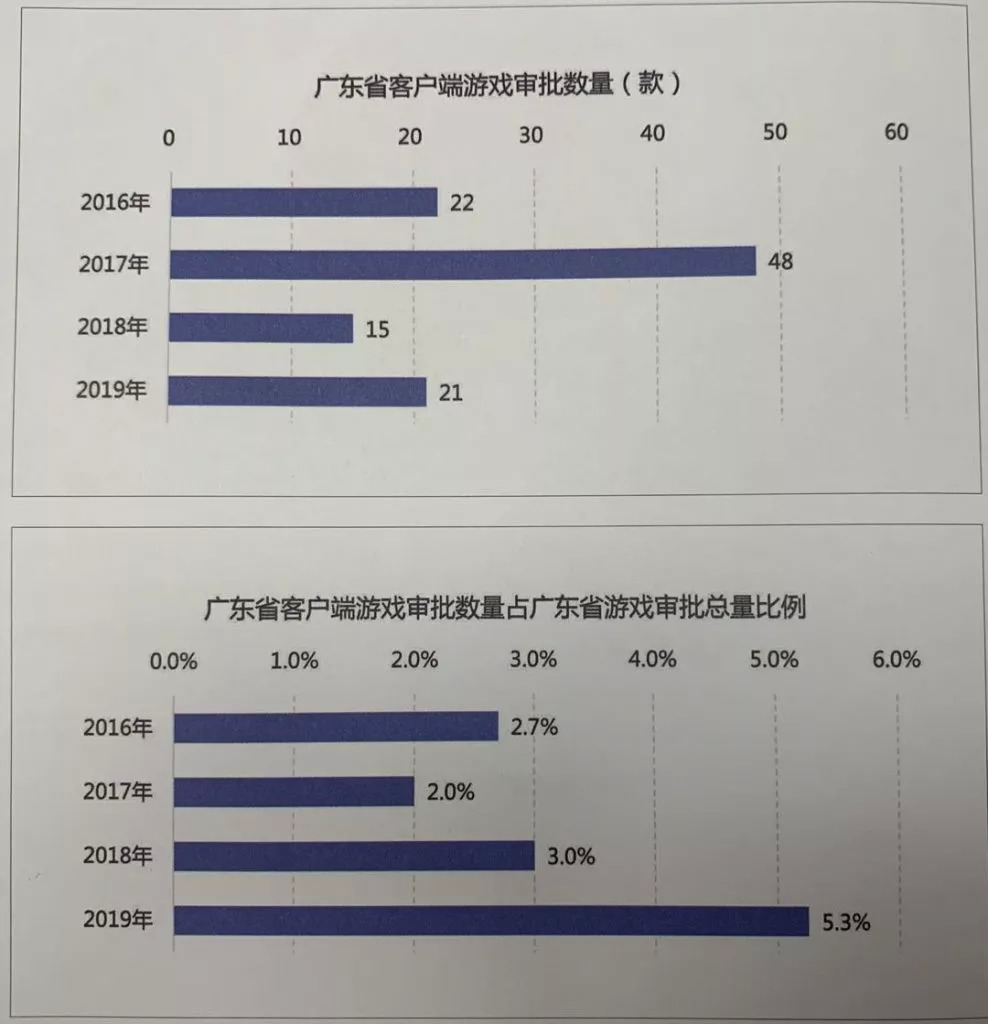 客户端游戏审批量为21款,与2018年相比增加了6款,占广东游戏审批总量的5.3%。在具体产品上,《寻仙2》《英雄联盟》等具备一定影响力的游戏产品均获得了版号,有望进一步提升市场活力。